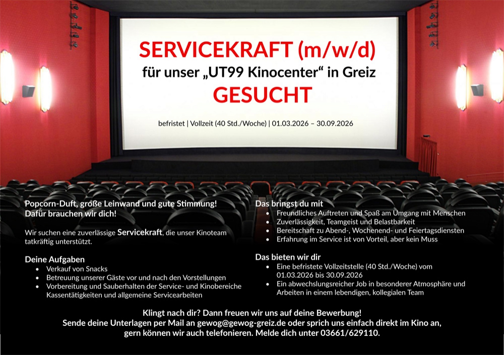 Das UT99 KINOCENTER ist ein modernes 4-Säle-Center in der Innenstadt von Greiz.